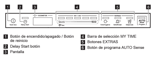 En un panel de control como este, para reiniciar el aparato, mantenga presionado el botón Opción y el botón Retraso hasta que el aparato haya regresado al modo de selección de programas.